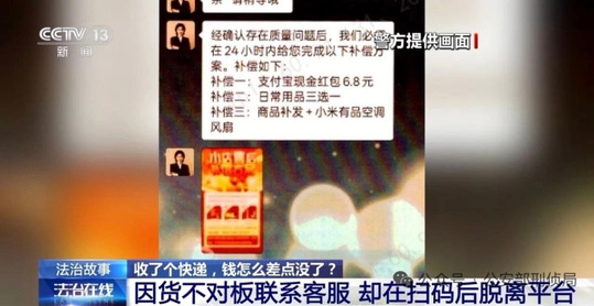 近日,北京市公安局刑侦总队反诈中心紧急曝光了一类新型电信网络诈骗手段:诈骗分子通过开设网店,故意发错货或寄送劣质商品,再以“售后补偿”为诱饵进行引流,诱导消费者脱离官方平台私下交易,最终实施诈骗。此类骗局已在淘宝、抖音、快手等多个知名平台出现。