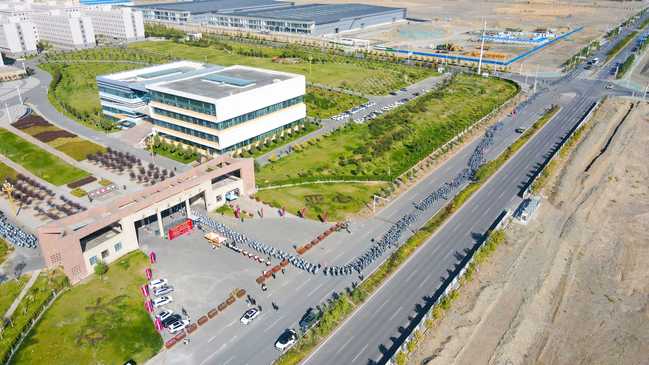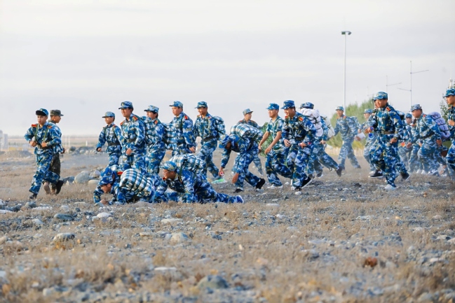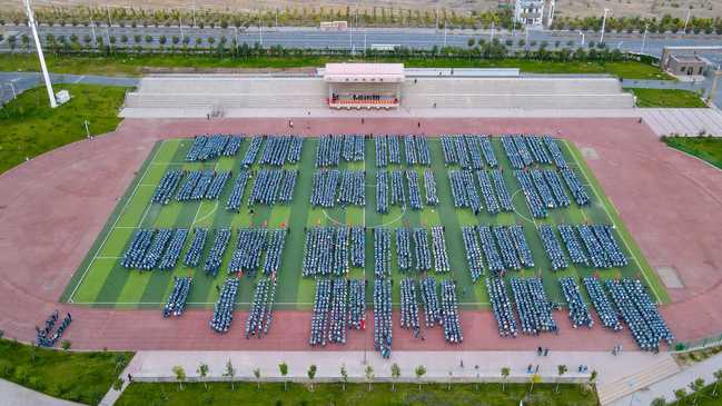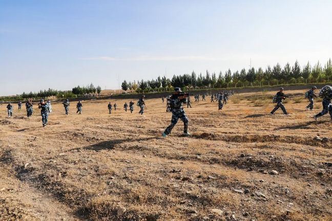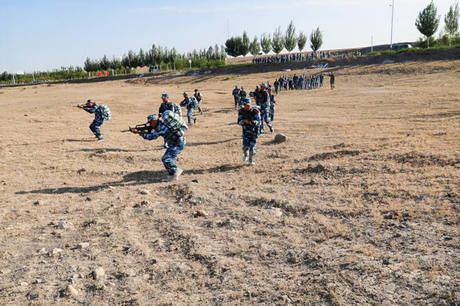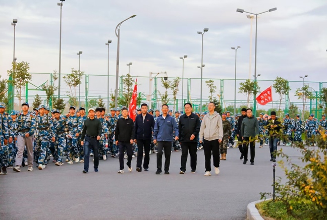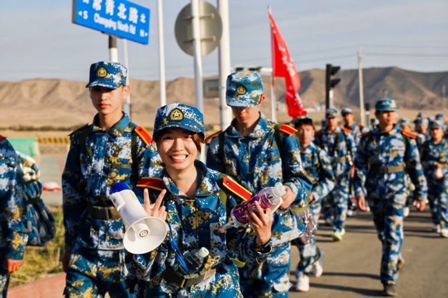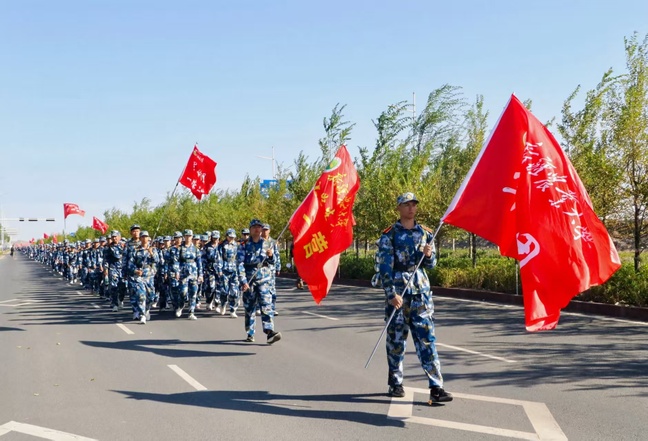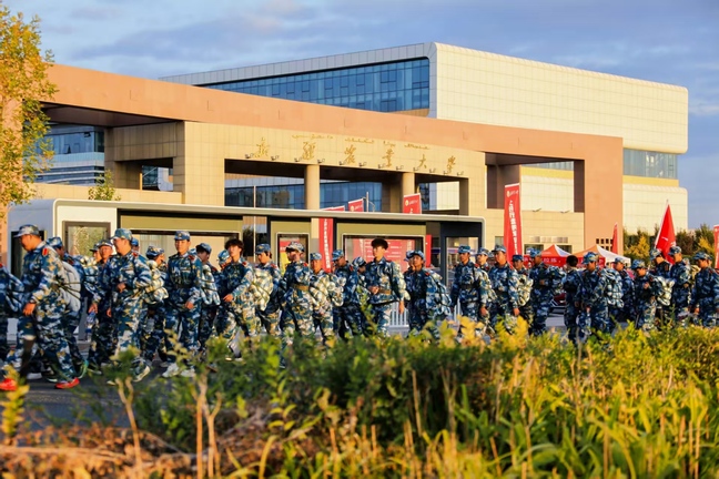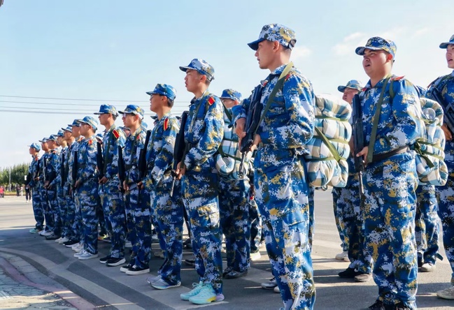 晨光熹微,迷彩方阵整齐列队,背包、补给,装备齐全。新疆农业大学2025级新生10公里拉练整装待发。