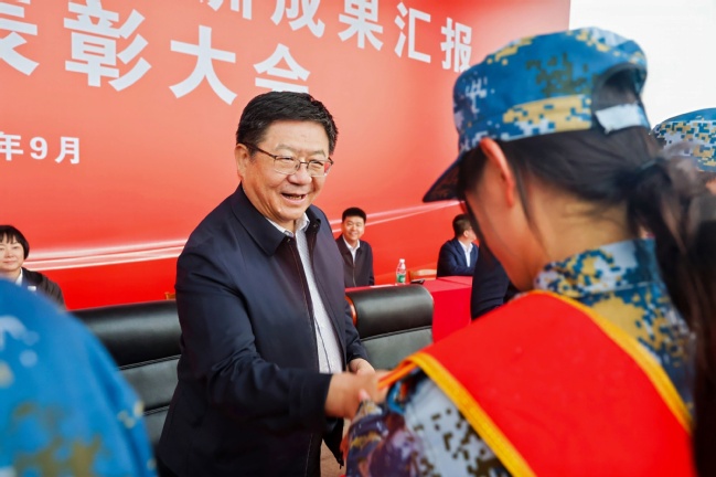 党委常委、纪委书记、监察专员万净敏宣读表彰决定,农学院等9个单位获“军训先进单位”,马清等20人获评“军训先进工作者”,黎明等98名教官及692名学员分获“优秀教官”“优秀学员”称号。党委书记谢树青向承训单位赠送锦旗。