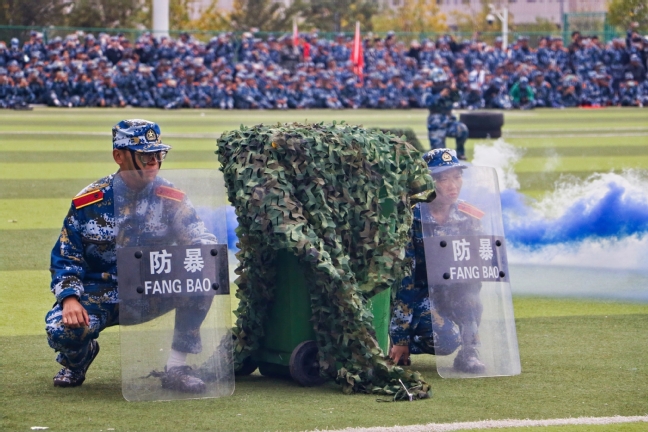 战术表演中,队列方阵步伐铿锵,彩旗方阵色彩飞扬;刺杀方阵气势如虹,匕首操凌厉迅猛,警棍术刚劲有力;擒敌方阵学生与教官先后登场、拳脚生风,战术方阵则以模拟实战场景尽显协同作战能力。