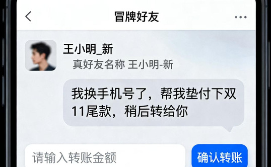“我手机号换了,刚付定金的鞋差200元尾款,你先帮我付了,回头转你。”收到这种消息别慌着转账!骗子会伪装成好友的形象,社交账号、头像、昵称都一模一样!!发送急迫的转账请求。他们常以“信号不好”“手机故障”为由拒绝语音通话,让你无法及时核实身份。