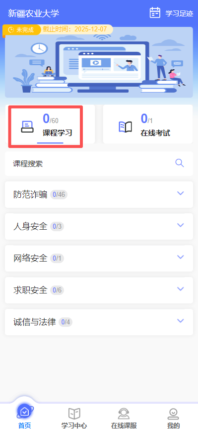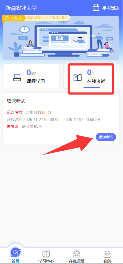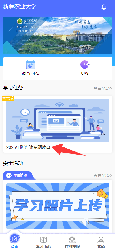 【首页】→【2025年防诈骗专题教育】,进入课程学习,完成该项目的所有微课学习后,进入【在线考试】,点击【参加考试】即可参加结课考试,有3次考试机会,最终成绩取最高分值。