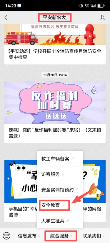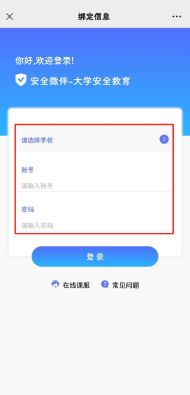 2.公众号菜单栏【综合服务】——【安全教育】——【开始学习】→选择学校名称,输入账号、密码,点【登录】绑定信息,如更换微信号,则需重新绑定;