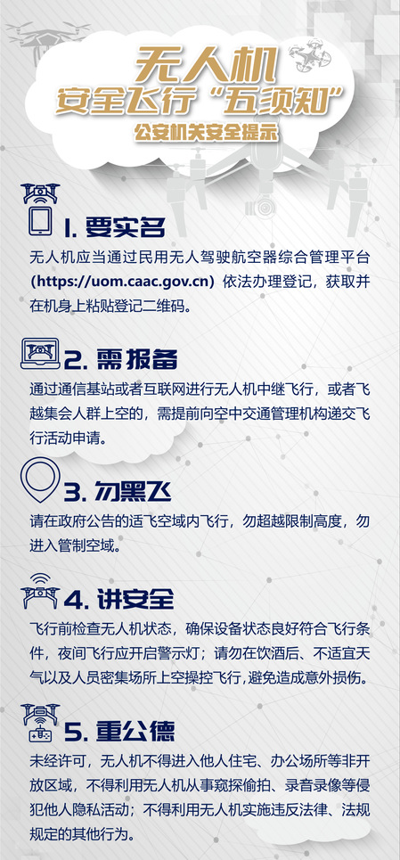 2.禁止“黑飞”。操控轻型民用无人驾驶航空器需取得安全操控理论培训合格证明;操控小型、中型、大型