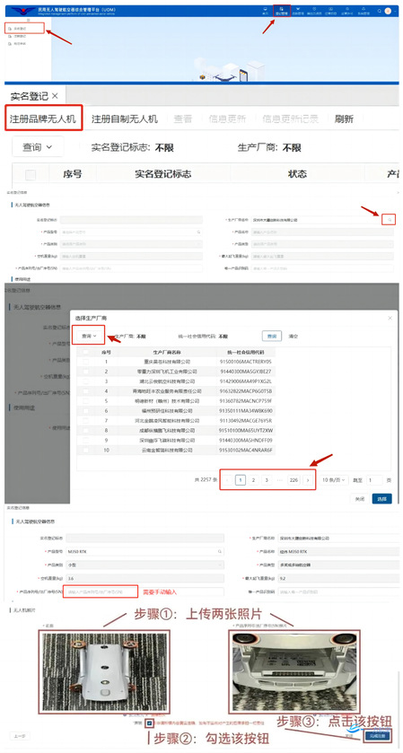 登录好进入首页——点击右上角登记管理——实名登记——注册品牌无人机——验证所有人信息——手机扫码刷脸验证——选择生产商名称(可一页页看,也可直接输入搜索)——选择型号等相关信息(序列号需手动输入)——根据要求长传照片——完成注册。