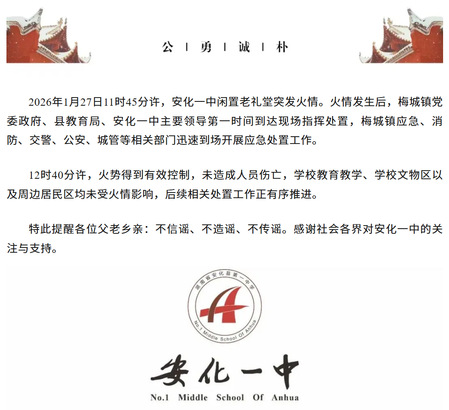 2026年1月27日上午,湖南省益阳市安化一中闲置老礼堂突发火灾,现场火势熊熊,浓烟冲天。当天中午,校方发布通告:火灾未造成人员伤亡。